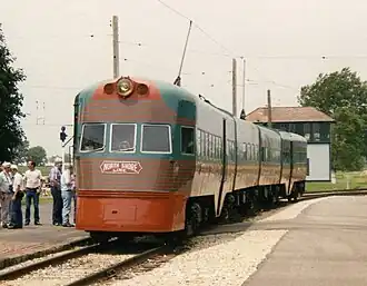 The sets were designed to operate with the high platforms, sharp curves, and narrow clearances of the Chicago Loop and the Chicago 'L', to run at speeds of 80 miles per hour (130 km/h) or more on the North Shore's main line, and to use city streets to the downtown Milwaukee Terminal. The sets' styling resembled that of the Pioneer Zephyr and influenced the styling of other electric trainsets, notably the Odakyū 3000 series SE Romance Cars. The articulated truck/bogie design allowed very smooth running with none of the horizontal movement characteristic of non-articulated equipment. Although they were streamlined, the sets were not permitted to run faster than conventional North Shore equipment. From the front passenger seat adjacent to the motorman's half cab, if the door was propped open, a passenger could see the speedometer pegged at 90 mph on the long stretch between Dempster Street and North Chicago Junction. When the sets were received in 1941, during one test run the traction motors were allowed full field shunt to determine absolute maximum speed. It reached just over 110 mph (180 km/h)[2] , but at that speed the train reached highway crossings before the crossing gates fully closed, a dangerous situation. Thereafter, the sets were limited to 90 mph (140 km/h).[3][2]