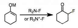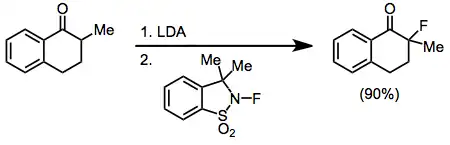 Metal enolates are compatible with many fluorinating reagents, including NFSI, NFOBS, and sulfonamides. However, the specialized reagent 2-fluoro-3,3-dimethyl-2,3-dihydrobenzo[d]isothiazole 1,1-dioxide consistently affords better yields of monofluorinated carbonyl compounds in reactions with lithium enolates. Other metal enolates afforded large amounts of difluorinated products.[14]