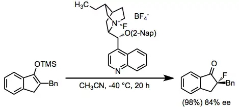 Enantioselective methods employ stoichiometric amounts of chiral fluorinating agents. N-fluoroammonium salts of cinchona alkaloids represent the state of the art for reactions of this type. In addition, these reagents are easily synthesized from Selectfluor and the parent alkaloids.[7]