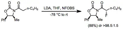Stereoselective fluorinations may be either diastereoselective or enantioselective. Diastereoselective methods have focused on the use of chiral auxiliaries on the nucleophilic substrate. For fluorinations of carbonyl compounds, chiral oxazolidinones have been used with success.[6]