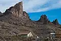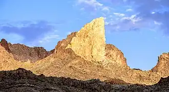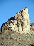 Elephants Tooth is situated in the Black Mountains, 0.7 mile east of the community of Oatman and rising nearly 1,000 feet above it. The landmark is a rhyolitic intrusion of Miocene to Oligocene age surrounded by darker rock of dacitic lava.[5] This geological feature lies within the Colorado River drainage basin, with the river approximately 14 miles to the west.[1] In 1902, Ben Taddock discovered gold flecks and nuggets in the vicinity of Elephants Tooth, and by 1907 the mine that sprang up there had produced $3 million.[6] The toponym has been officially adopted by the U.S. Board on Geographic Names.[3]