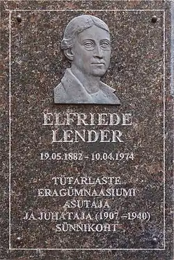 Elfriede Amanda Lender (19 May 1882 Tallinn – 10 April 1974 Stockholm) was an Estonian teacher and pedagogue. Lender was the founder of the first Estonian-language girls' school in the Estonia.[1]