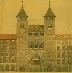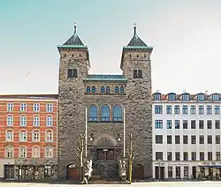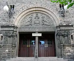A broad steep flight of stairs leads to the main entrance. It contains a shed which was put at the disposal of the municipal park authority for wheelbarrows and other tools and materials. When Nyrop's design was first published, the city made a demand for DKK 700 in rent for the area of the square taken up by the stairs. The shed was a compromise.[1] The stairs are clad in the same split sandstone from Nexø which covers the façade. It is decorated with carved sheaves.