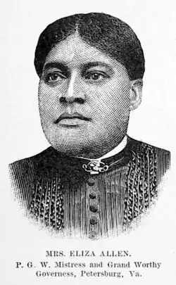 Allen joined the Grand United Order of True Reformers when it was reestablished in Richmond, Virginia in 1875.[3] She then established one of its first three chapters, called fountains.[3] She was the founder of the Shiloh Fountain No. 6 (later No. 20) in Petersburg, Virginia.[5][2] In 1881, she was elected the national Grand Worthy Mistress of the United Order which served jointly with the Grand Worthy Master.[6] She served in this office for six years.[2] She continued to serve on the grand board as the Governess who oversaw the Rosebuds, the girl's arm of the order, from its founding in 1885 to 1892.[7][2] When retired from the position, she was made Grand Worthy Governess for life.[8]