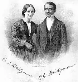 In 1862 she was forced to take a furlough in the United States due to health concerns after her husband's death, during which she was run over by a sled.[1][4] Bridgman returned to Peking in 1864, where she opened up Bridgman Girls' College after obtaining substantial land. The Teng Shih K'ou Congregational Church was built in the same year, as part of the college. The academy later became the Women's College of Yenching University and is credited with educating a large number of female Chinese leaders.[4]