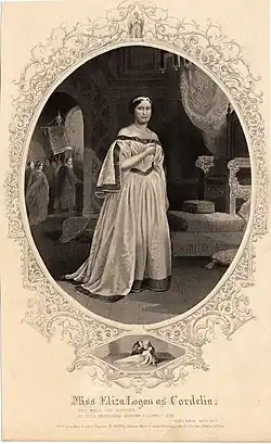 Probably the oldest of the eight talented children of Irish-American actor Cornelius Ambrosius Logan (1806-1853), Eliza was educated at a girls' school in Lancaster, Pennsylvania. She made her debut on the stage January 28, 1841 as Young Norval in "Douglas" at the Walnut Street Theatre in Philadelphia.[1] Her father had moved the family to Cincinnati to manage the National Theatre there, and she continued her career there. She later toured with her father, appearing with success in the American South and West in dramas such as Shiel's Evadne.[2] In June 1850 she made her first appearance in New York as Pauline in "The Lady of Lyons" at the Bowery Theatre. She remained a headlining actress through the 1850s, while supporting her mother and younger siblings after the death of her father in 1853.