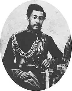 Eliza became the mistress of King Lunalilo, who had remained a bachelor for his entire life.[1][12] She developed a contentious relationship with Queen Emma of Hawaii, the widow of Kamehameha IV and a close friend of Lunalilo. According to one of Emma's letters, an elderly palace attendant Waiaha and several other older women had given Lunalilo a "piece of bananannah [sic] stalk pressed to drink, medicated with love potions, to produce intense affections for Eliza Meek".[1] Along with a group of Lunalilo's personal attendants and relatives (including his chamberlain and Eliza's brother-in-law Horace Crabbe), Eliza was present during the king's final months of illness. During this period, Eliza was notoriously hostile to Emma, who occasionally visited the ailing King to help nurse him. According to Dr. Georges Phillipe Trousseau, the King's personal physician, Lunalilo would have married Emma had it not been for Eliza's interference.[13] Eliza would refuse to leave Emma alone with Lunalilo even at the king's command.[11][14] One night, in a fit of rage, Lunalilo threw a chair and a spittoon at Eliza's head after an argument with between the two. Emma recounted the instance in a letter to her cousin Peter Kaʻeo: