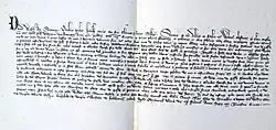 In addition to that recorded in the Records of Parliaments of Scotland [2][3] for Gask, there are a number of other royal charters, mostly similar regrants, of the same date signed by King David II, in which Elizabeth is described as "dilecte sorori me" - "my beloved sister".[5] and "dilecte sorori nostre" - "our beloved sister".[6][7][8][9] which thus remove that doubt. In all, there are similar charters for the lands and baronies of Gask, Dupplin, Ochtertyre, Newtyle, Kynprony (Kinpurnie), Turyngs (Turin) and Dromy (Drimmie).[10] The reason for the existence of so many charters was that Sir Walter Olifaunt and Elizabeth Bruce his wife had obtained reconfirmation of their landholdings and baronies from her brother King David II in 1364.