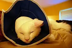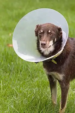 An Elizabethan collar, E collar, buster collar, pet ruff or pet cone (sometimes humorously called a treat funnel, lamp-shade, radar dish, dog-saver, collar cone, or the cone of shame) is a protective medical device worn by an animal, usually a cat or dog. Shaped like a truncated cone, its purpose is to prevent the animal from biting or licking at its body or scratching at its head or neck while wounds or injuries heal.[1] The collars are named from the ruffs worn in the Elizabethan era.[2]