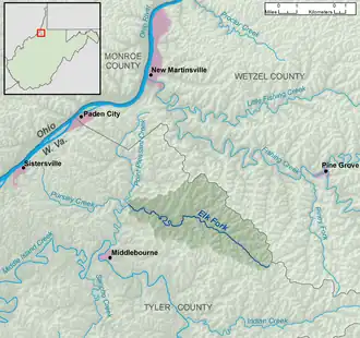 The Elk Fork is a tributary of Point Pleasant Creek, 14.8 miles (23.8 km) long,[3] in northwestern West Virginia in the United States. Via Point Pleasant Creek, Middle Island Creek, and the Ohio River, it is part of the watershed of the Mississippi River, draining an area of 21.1 square miles (55 km2)[4] in a rural region on the unglaciated portion of the Allegheny Plateau.