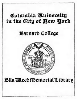 ![]() Bookplate of the Ella Weed Memorial Library at Barnard College | |