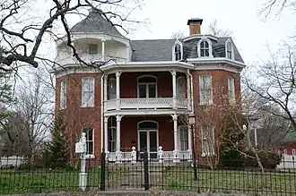 The Elliott House is a historic house at 303 South Third Street in Bentonville, Arkansas. It is a large three-story brick house with Italianate style, built in 1887 for Harry Elliott, who made a fortune investing in silver mines in Silver City, New Mexico. The house is distinctive for its use of brick on the interior as well as exterior walls; those on the inside are 8 inches (20 cm) thick, those outside are 16 inches (41 cm). The exterior features include seven porches, a widow's walk, and carved brackets in deeply overhanging eaves.[2]