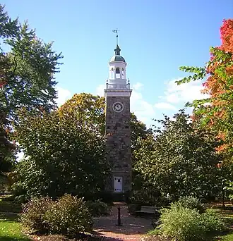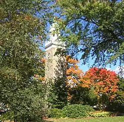 Elm Park, also known as Clocktower Park, is a historic park near the junction of Massachusetts Route 16 and Massachusetts Route 9 in the Wellesley Hills section of Wellesley, Massachusetts. It is a triangular parcel of 1.24 acres (0.50 ha), laid out for passive recreation. Its focal point is the 75-foot (23 m) brick and masonry Sprague Tower, designed by Benjamin Proctor, Jr., and built in 1928 to house a clock and bell given to the town in 1874. A portion of the now-defunct Cochituate Aqueduct passes through the park. Land for the park was acquired in 1908 by the town with funds raised by the community; the clock and bell were the gift of John Shaw. Isaac Sprague, for whom the tower is named, sat on the committee which oversaw its construction, and donated materials for that purpose.[2]