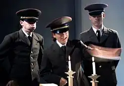 A huge kitchen table turns into a battlefield on which quarreling lovers, staged in allusion to the meeting between Winston Churchill (Hess mimes) and Adolf Hitler.