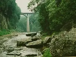 The Elora Gorge and its Conservation Area are at the edge of town. The park offers canoeing, paddleboat rentals, hiking, camp-grounds, fishing and picnicking.[34] Some of the limestone cliffs are 12 metres (40 feet) high. At the eastern end of the village is the Elora Quarry Conservation Area, a scenic former limestone quarry, and is now a popular swimming area.[35]