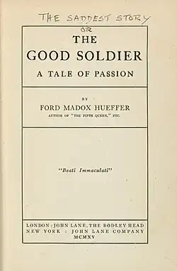 Ford's attempts to divorce Hueffer and marry Hunt inspired his time-travelling novel Ladies Whose Bright Eyes (pub. 1911).[30] The Good Soldier (pub. 1915) reflected “the agonies Ford went through with his wife and his mistress in the six preceding years.”[31]