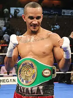 ![]() Ayala with the WBC USNBC middleweight championship belt on July 29, 2011 | |