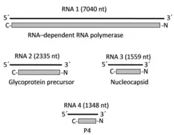 The genomes are segmented, consisting of four strands of negative-sense single-stranded RNA.[1]