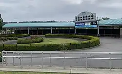 Beside the grandstand is a paddock and covered horse saddling area. Paved surfaces around the paddock and up to the saddling area provide spectators an opportunity to view the horses when the horses are in these areas.[3] Prior to the start of each race, horses are walked through the paddock into the saddling area, walked around the saddling area a few times and their saddles put on. Once the horses are saddled, they are walked once around the paddock before the jockey mounts the horse and the horses are walked out to the race track.[4]