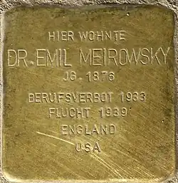 When the Nazis came to power in 1933, Meirowsky was persecuted because of his Jewish heritage. On November 24, 1933, his teaching license at the University of Cologne was revoked, in February 1936 his academic titles were revoked, and in 1938 he was forced to give up his practice. In 1939 he emigrated to England with his wife Clara and their 29-year-old son Arnold. From 1942 he worked at the Royal Surrey Hospital in Guilford. In 1946 he received an offer to return to teaching at Cologne University. After the war, when the Meirowsky couple learned that their daughter Lisamaria had been murdered in the Holocaust, the family decided never to return to Germany.[2] On May 2, 1947, Emil Meirowsky emigrated to the United States with his wife and son. There he taught at Indiana University Medical School until 1953.