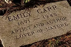 In 1942 Carr established the Emily Carr Trust, and donated close to 170 paintings to the Vancouver Art Gallery. She had the only successful commercial show of her career at the Dominion Gallery in Montreal in 1944.[49] She suffered her last heart attack and died on March 2, 1945, at the James Bay Inn in her hometown of Victoria, British Columbia, shortly before she was to have been awarded an honorary doctorate by the University of British Columbia.[50] Carr is buried at Ross Bay Cemetery.