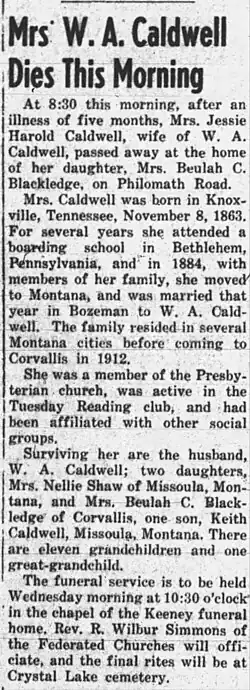 - ^ Oregon State Archives; Salem, Oregon; Oregon, Death Records, 1864-1967, Ancestry.com. Oregon, U.S., State Deaths, 1864-1971 Jessie Harold Caldwell, Female, White, 77, 1863, 29 Sep 1941, Corvallis, Benton, Oregon, USA, Father: James W. Harold, Mother: Emily Harold, Spouse: W. A. Caldwell, Certificate Number 139