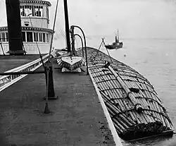Hayward was towed back around to the Columbia river by the large ocean-going steam tug Escort, also known as Escort No. 2 (built 1882; 146 tons).[26][27][28] This was the first time in the history of the Northwest that a sternwheeler had made the voyage without a wheel in place and without having steam up.[26] Sternwheel propelled-boats, in addition to being lightly built for inland work, would have difficulty keeping the sternwheel in the water as ocean swells would lift the paddles clear from the water.[26] Towing was expected to alleviate these difficulties.[26]