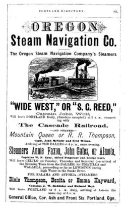 - ^ a b c d e f "Oregon Steam Navigation Company". Traveler's Guide and Oregon Railroad Gazetteer. 3. Portland, OR: Leopold Samuel: 82. July 1872.