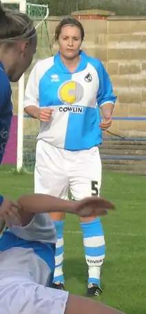Emma Louise Jones (born 21 August 1982)[3] is a former footballer who played as a central defender. She accumulated a century of caps for Wales.