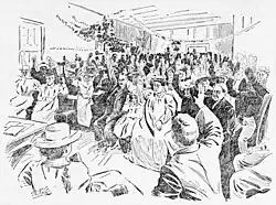 After Nāwahī's death, Emma became an important political leader in her own right, continuing the legacy of her husband.[26] In 1897, Emma and members of both the male and female branches of Hui Aloha ʻĀina collected over 21,000 signatures by the residents of the Hawaiian Islands opposing an annexation treaty being discussed on the floors of the United States Senate. These Kūʻē Petitions were submitted by a delegation of Native Hawaiians and was used as evidence of the strong resistance of the Hawaiian community to annexation, and the treaty was defeated in the Senate. After the failure of the treaty, Hawaiʻi was instead annexed by the Newlands Resolution, issued in July 1898, shortly after the outbreak of the Spanish–American War.[27][17][28]