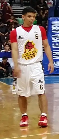 On October 31, 2013, he was traded to Barangay Ginebra San Miguel to bolster their backcourt, sending Robert Labagala to Barako Bull.[39] There, he was the backup to LA Tenorio, a former Ateneo point guard.[40] In a 2013–14 Philippine Cup win over the Talk 'N Text Tropang Texters, he didn't score a point, but made an impact on the game with two rebounds and five assists. He then played 24 minutes in a win over the Alaska Aces and contributed five rebounds (including two offensive), five assists and two steals. In a game against his former team Barako, with Ginebra down by 10, he ignited a rally with his defense and three-pointers that led to Ginebra taking the win.[41]