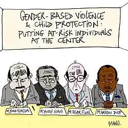 He has contributed cartoons and illustrations to several humanitarian publications and campaigns, including for the Sphere Standards and the International Peace Institute's Management Handbook for UN Peacekeeping missions.[42]