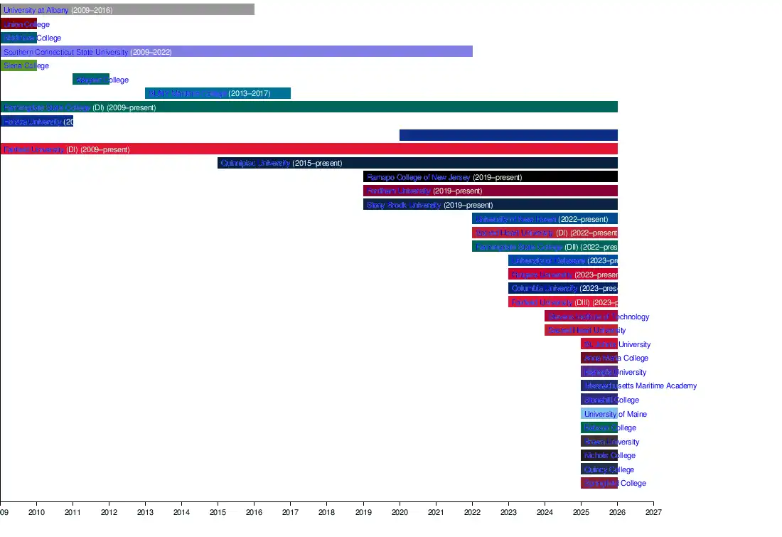 Since 2009, the ECHC has seen various esteemed institutions join and depart, each contributing to the rich legacy of the conference. The inaugural 2009–10 season saw the University of Albany, Farmingdale State College, Hofstra University, Union College, Skidmore College, Southern Connecticut State University, Siena College, and Fairfield University laying the foundation. Union College and Skidmore College exited after the first season, while Wagner College joined in 2011–12 but departed after a single season. SUNY Maritime became a key member from 2013–14 until 2016–17, and Quinnipiac University joined in 2015–16, becoming a mainstay.[3]