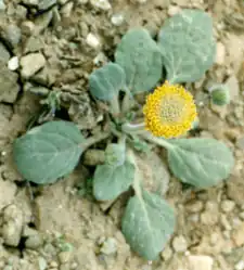 Encelia nutans is a shrub up to 25 cm (10 inches) tall, with swollen roots up to 10 cm (4 inches) in diameter. Leaves are small and green, egg-shaped, rarely more than 5 cm (2 inches) long. Flower heads are produced one per stem, with yellow disc florets but no ray florets.[5][6][2]