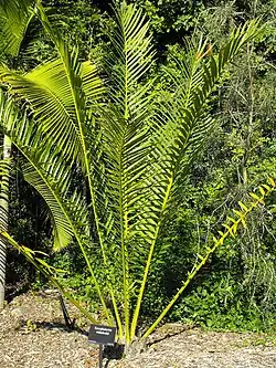 - Leaves: 310–410 cm long, dark green, highly glossy, slightly keeled (opposing leaflets inserted at 160° on rachis). Rachis green, gently curved, somewhat lax or straight with last third sharply recurved, not spirally twisted. Petiole straight, with 6-12 prickles, spine-free for 13 cm; leaf-base collar not present; basal leaflets reducing to spines. Leaflets lanceolate, strongly discolorous, not overlapping, not lobed, insertion angle horizontal; margins flat; upper margin heavily toothed (more than 3 teeth); lower margin heavily toothed (more than 3 teeth); median leaflets 23–30 cm long, 20–28 mm wide.