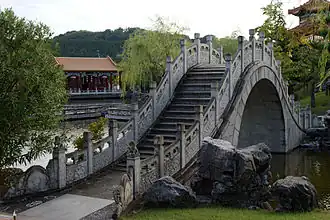 Enchō-en occupies an area of 10,000 m2 on the southern shore of Lake Tōgō, against the backdrop of the local mountains.[1][3] The gardens were designed by an architect from Hebei in imitation of an imperial Chinese garden, incorporating materials and trees sourced from China.[1][4] The gardens feature twenty-eight celebrated views, including a miniature mountain made of stone from Yanshan, a lotus pond, bridges, gates, and pavilions.[5] The roof tiles are yellow, a colour formerly reserved for the Chinese Emperor, and the walls painted with Chinese dragons and decorative motifs.[3] There is also a hall for performances of Peking Opera and exhibitions of Chinese Art.[5]