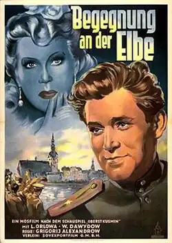 Encounter at the Elbe (Russian: Встреча на Эльбе, romanized: Vstrecha na Elbe) is a Soviet war film released in 1949 from Mosfilm, describing the conflict, spying, and collaboration between the Soviet Army advancing from the east and the U.S. Army advancing from the west. The two allied forces met each other for the first time on the River Elbe near the end of the World War II. This meeting occurred on April 25, 1945, which was usually remembered as “Elbe Day” in Western Bloc nations and as the "Encounter at the Elbe” in Eastern Bloc nations.[1]