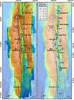 - ^ a b c d Clague, David A.; Martin, Julie F.; Paduan, Jennifer B.; Butterfield, David A.; Jamieson, John W.; Le Saout, Morgane; Caress, David W.; Thomas, Hans; Holden, James F.; Kelley, Deborah S. (2020). "Hydrothermal Chimney Distribution on the Endeavour Segment, Juan de Fuca Ridge". Geochemistry, Geophysics, Geosystems. 21 (6). Bibcode:2020GGG....2108917C. doi:10.1029/2020GC008917. ISSN 1525-2027. S2CID 218825220.