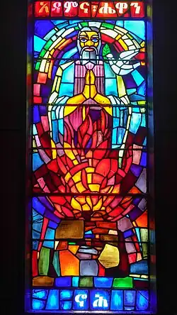 Hevizi also worked with Bajó to decorate the Greek State Tourist Office on Regent Street, London. The Co-operative Wholesale Society commissioned Bajó and Hevizi to complete a number of stained-glass windows and mosaics for the Debre Libanos monastery in the Ethiopian Empire, including the largest mosaics (measuring more than 600 square feet (56 m2)) ever made in England at that time.[2] The mosaics included glass imported from Sweden, Italy, Greece and Turkey and were exhibited at the Royal Festival Hall in 1965.[2] His contributions for Debre Libanos also included stained-glass panels. This required that he learn the technique "from a very clever little book", and also that he ask a friend to instruct him about the prices.[3] In 2015, he recalled a series of meetings with Emperor Haile Selassie, who was "always asking what special reward I would take for my services. I didn't say anything, even though I should have, because they were still in debt with the last installment. In fact, a friend of mine went there recently and the tour guide said that an Ethiopian man did the work."[3]