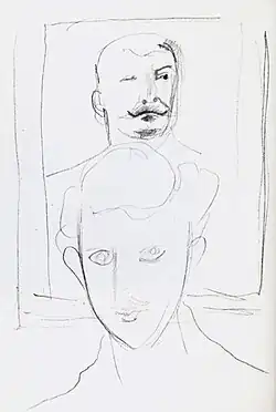Studying the differences between Rozsda's paintings and drawings, Sarane Alexandrian discovered another intriguing feature. In some "of the drawings we find a quality not seen in his paintings, or hidden with such perfection as to make it invisible at first glance: humor. With a simple line of the pencil or pen, Rozsda is capable of mocking various aspects of observed reality. (...) In most cases, his sense of humor works in the world of imagination; he likes to create shocking human forms: a trumpet-mouthed figure whose chest and thighs are covered with female breasts. There is also a grotesque trapeze-shaped woman resembling Mama Ubu. His male portrait, showing a man with an open mouth yawning (or yelling?) with circle-shaped wrinkles around the chin, is simultaneously tragic and comic". Alexandrian draws the following conclusion: "This artist dares to be ambiguous and go out on a limb where pain and pleasure, laughter and terror converge".[12]