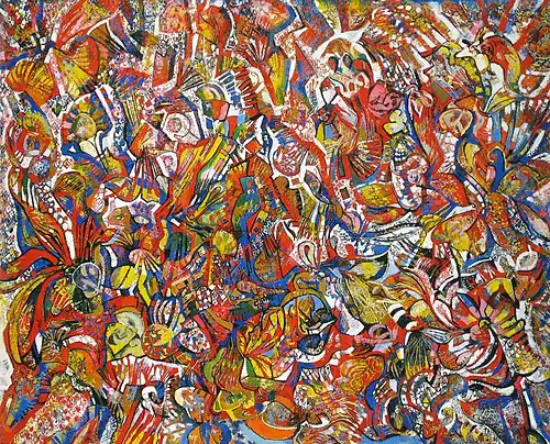 In the next few years the psychedelic swirling of motifs regularly morphed into architectonic structures in his paintings. While these structures were not geometric or systematic, they pointed in the direction of some kind of order. Rozsda's intention may have been to rearrange a shattered world into a system – built on the tensions and harmonies of color and form – where the rules of the conventional three-dimensional space no longer apply and where, as a result, the horizon of time may be represented as well. Examples include Headlong into a dream (1960), The Tower of Babel (1958–1961) and Saphirogramme (1969).