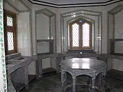 The landscaping was designed by Humphry Repton and the grounds originally comprised a plantation of 300 acres, including a thickly wooded slope going down to the river, and gardens of 20 acres. The buildings in the grounds include the Shell Grotto, a polygonal summer-house and the Swiss Cottage, restored by the Landmark Trust with a thatched roof. Also, the Dairy Dell, by Repton, Pond Cottages by a pool and the octagonal Dairy surrounded by a loggia, and the Holy Well, part of which is an ancient structure formerly situated at Leigh Barton, and used as the baptismal font of the hunting seat of the Abbots of Tavistock Abbey.[8] The following structures as well as the main house are Grade I listed: Rockery and Grotto, Stables, Salmon Larder and Ice House, Shell House and Grotto.