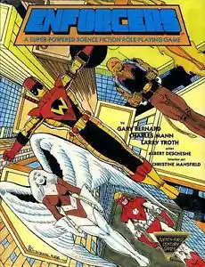 In the mid-1980s, superhero role-playing games such as Champions and Villains and Vigilantes were popular. Enforcers, a generic superhero game — that is, not based on a specific line of comics — was designed by Gary Bernard, Charles Mann, and Larry Troth, with art by Christine Mansfield, and was published by 21st Century Games in 1987 as a 112-page book with a blue cover.[1] The second edition was published the same year with a yellow cover, although it says 1st edition on the title page.[1]