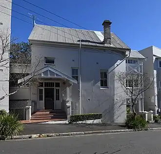 Begg, a Paddington alderman, built the nearby mansion Olive Bank on the grounds of Engehurst in 1869 and the amassed land around the Engehurst property during the following decade. Begg's son purchased the mansion Juniper Hall in 1872. In 1878, John Begg subdivided his property and demolished most of Engehurst in order to create Begg Street (later Ormonde Street).[1] This street crossed the stables, kitchen and main residence. It is thought that stone from demolished wings was used to build part of the first floor (i.e., above the former kitchen wing, source D). The servants' quarters were not affected by the street but were soon engulfed by new development in the late nineteenth century. The surviving portion of Engehurst, on a half acre property, remained as a single residence until, in the 1920s, the flanking apartment buildings were built and the original part divided into flats.[1] Max Kelly, in "A Paddock Full of Houses", writes that there is some doubt if Engehurst was completed, however the description in the For Sale notice 18 March 1886[8] is much the same as Verge intended and dimensions of rooms similar to those in Verge's drawings.[1][6] Begg was responsible for the subdivision of the three estates in 1878. Engehurst, with significantly reduced grounds, passed to Robert H. Reynolds, J.P.[1]
