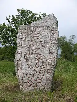 This stone is notable because it commemorates that the Viking Ulf of Borresta had taken three danegelds in England.[9] The first one was with Skagul Toste in 991,[11] the second one with Thorkel the High in 1012[11] and the last one with Canute the Great in 1018.[11] Since there were many years between the danegelds, it is likely that Ulfr returned to Sweden after each danegeld to live as a wealthy magnate.[12][13]