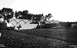The first G.IV aircraft arrived in March 1917, but teething problems requiring the complete replacement of their engines meant that they could not be flown fully-laden until early May, with the full compliment finally arriving at the end of that month. Brandenburg ordered that each aircraft should be test-flown for twenty-five hours before being considered operational.[14] Even so, there were numerous difficulties with landing, since the bombers became dangerously unstable without the ballast of fuel and bombs and it was difficult to avoid breaking the frail undercarriage. In April, the squadron dispersed to the new airfields at Sint-Denijs-Westrem, Gontrode (near Melle) and in the following month, Mariakerke and Oostakker. The officers were quartered centrally in a chateau at Borluut near Sint-Denijs, while Brandenburg set up his headquarters at Gontrode. On 24 May, the squadron was inspected at Sint-Denijs by General Ludendorff and declared operational.[15]