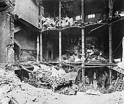 Between 25 May 1917 and 19 May 1918, the Gothas of the England Squadron, together with the Giants of Rfa 501, dropped 105,000 kg of high explosives and 6,500 kg of incendiaries on England.[62] The raids killed 837 people and injured 1,991, of which 486 deaths and 1,432 injuries were in the London area, representing 68% of the total. Material damage that they inflicted was estimated at £1.4 million, £1.2 million of that being in London. Although German hopes of being able to hit specific war-related targets were not realised, there were often severe falls in munitions production around the time of major raids.[63] Although the Germans also failed in their other aim of destroying the morale of Londoners to the extent that they pressured their government into suing for peace, the lack of preparation of civilians did engender mass panic at times and during the sustained "Harvest Moon raids" of October 1917, the capital was, by some accounts, close to collapse.[64] However, rather than pleading for peace, the public reaction was to vociferously demand retaliation.[65]