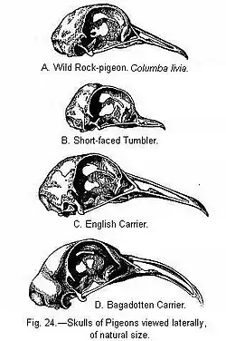 Charles Darwin wrote of the Carrier in The Variation of Animals and Plants Under Domestication, "This is a fine bird, of large size, close feathered, generally dark–coloured, with an elongated neck".[5] Darwin compared the dimensions of the breed to the rock dove, showing the length of the Carrier to be nearly double that of the rock dove. It was also found that the English Carrier could open its mouth wider than the rock dove, 0.75 inches (1.9 cm) as compared to 0.4 inches (1.0 cm).[5]