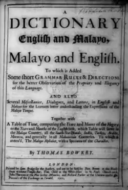 - ^ a b "BOWREY, Thomas. A dictionary English and Malayo, Malayo and English. To which is added some short grammar rules and directions for the better observation of the propriety and elegancy of this language. London, Sam. Bridge for the author, 1701". www.roots.gov.sg. Retrieved 2024-05-23.