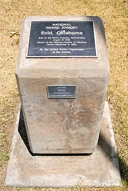 The cornerstone for the Enid Armory reads: "State Armory, built by Works Progress Administration 1936, W.S. Key, State Administrator.